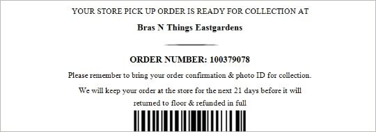 Click and Collect Orders must be collected within 21 days from the date you are notified by email that your Order is ready for collection. If your Order is not collected within this time, the Bras N Things store has the right to allocate those goods to another Customer and refund you.